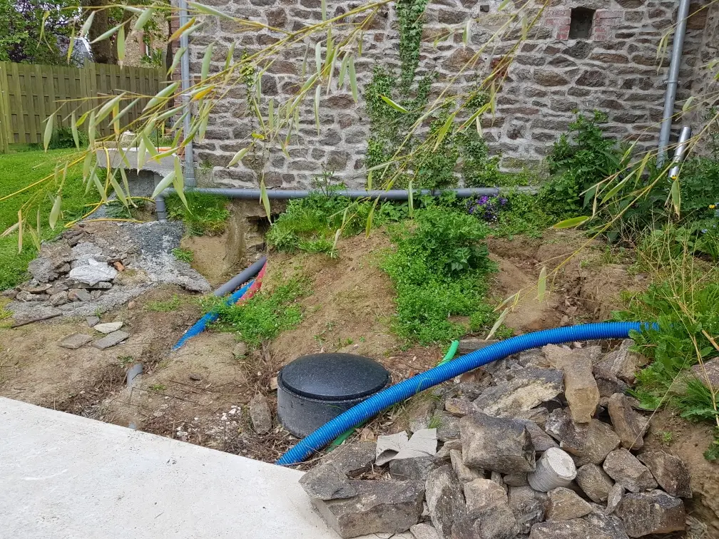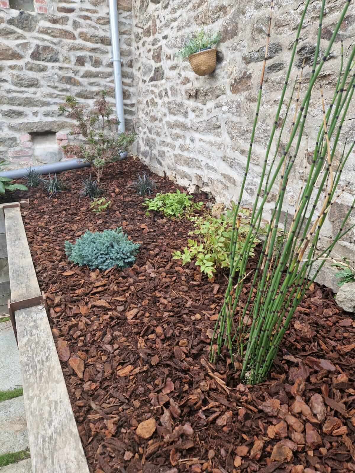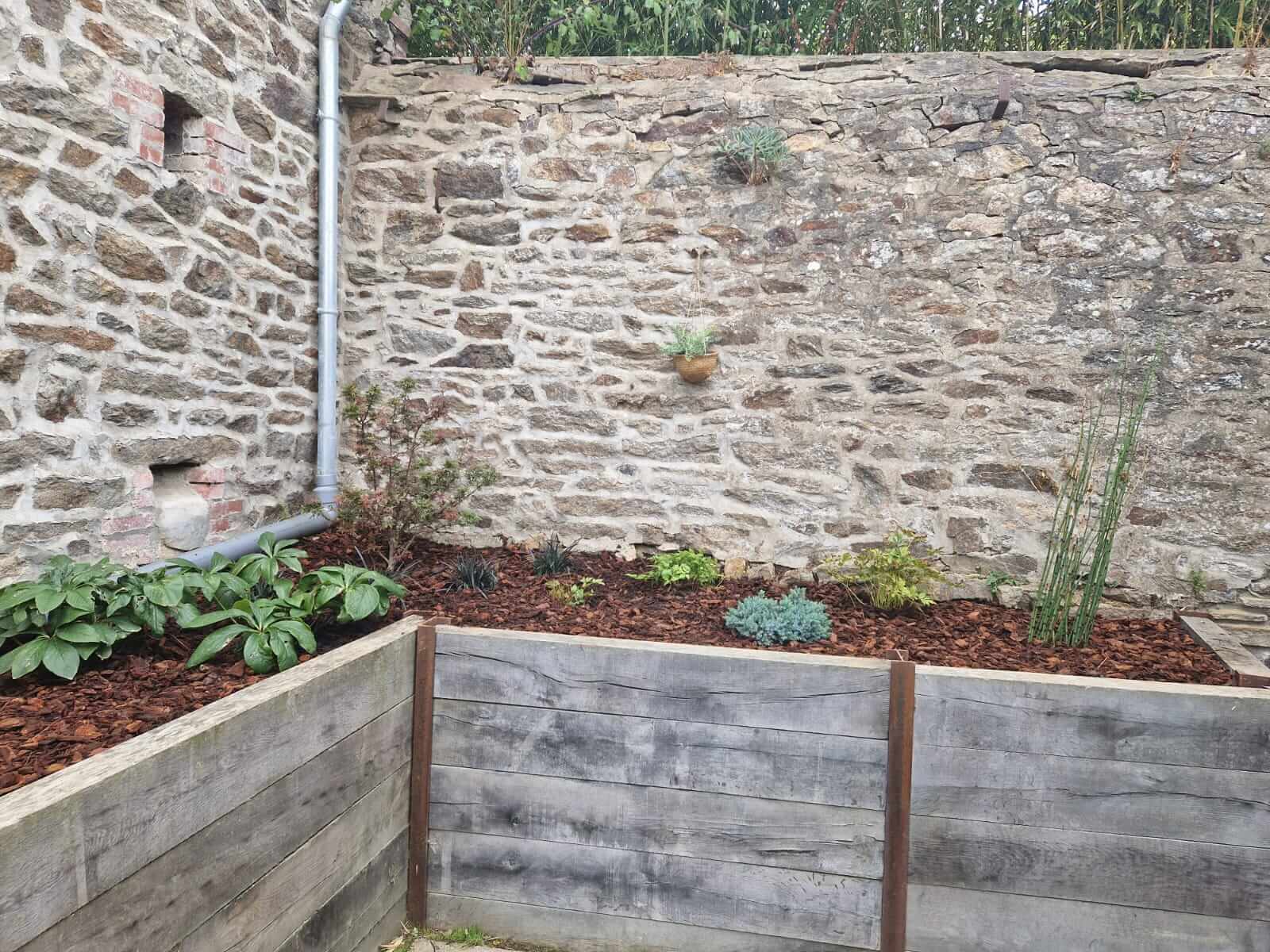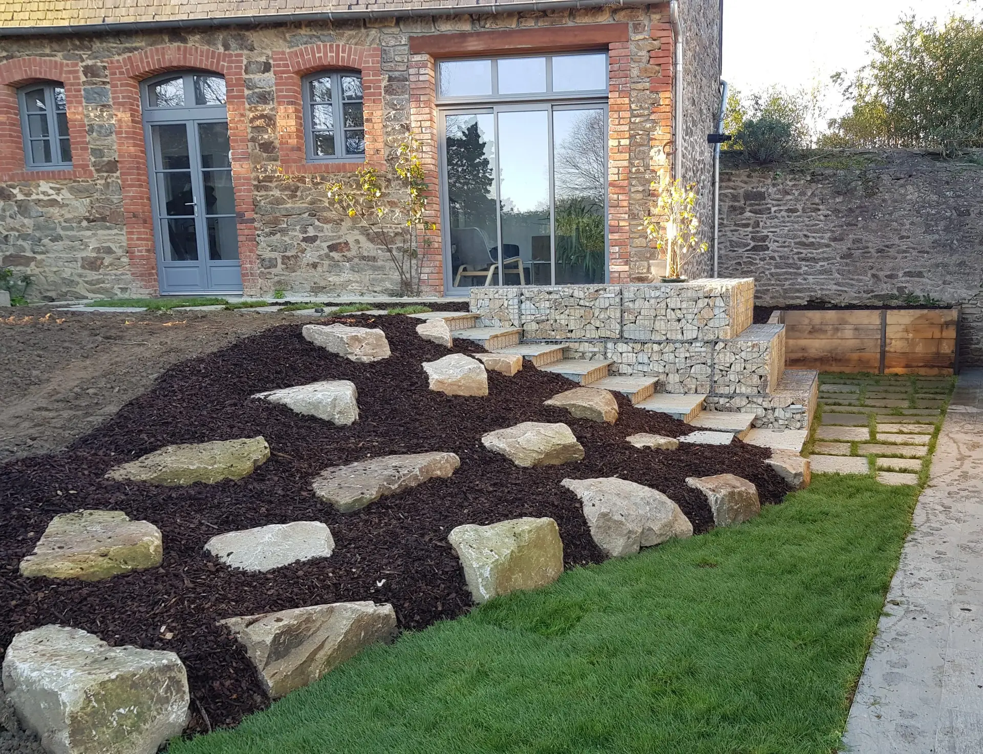 Nous avons imaginé une petite terrasse en pierre de luzerne avec joint gazon en y intégrant une partie végétale avec une retenue de terre en traverse en chêne et IPN. Une association gabion et dalle de luzerne ont été pensé pour pouvoir accéder à la dépendance.