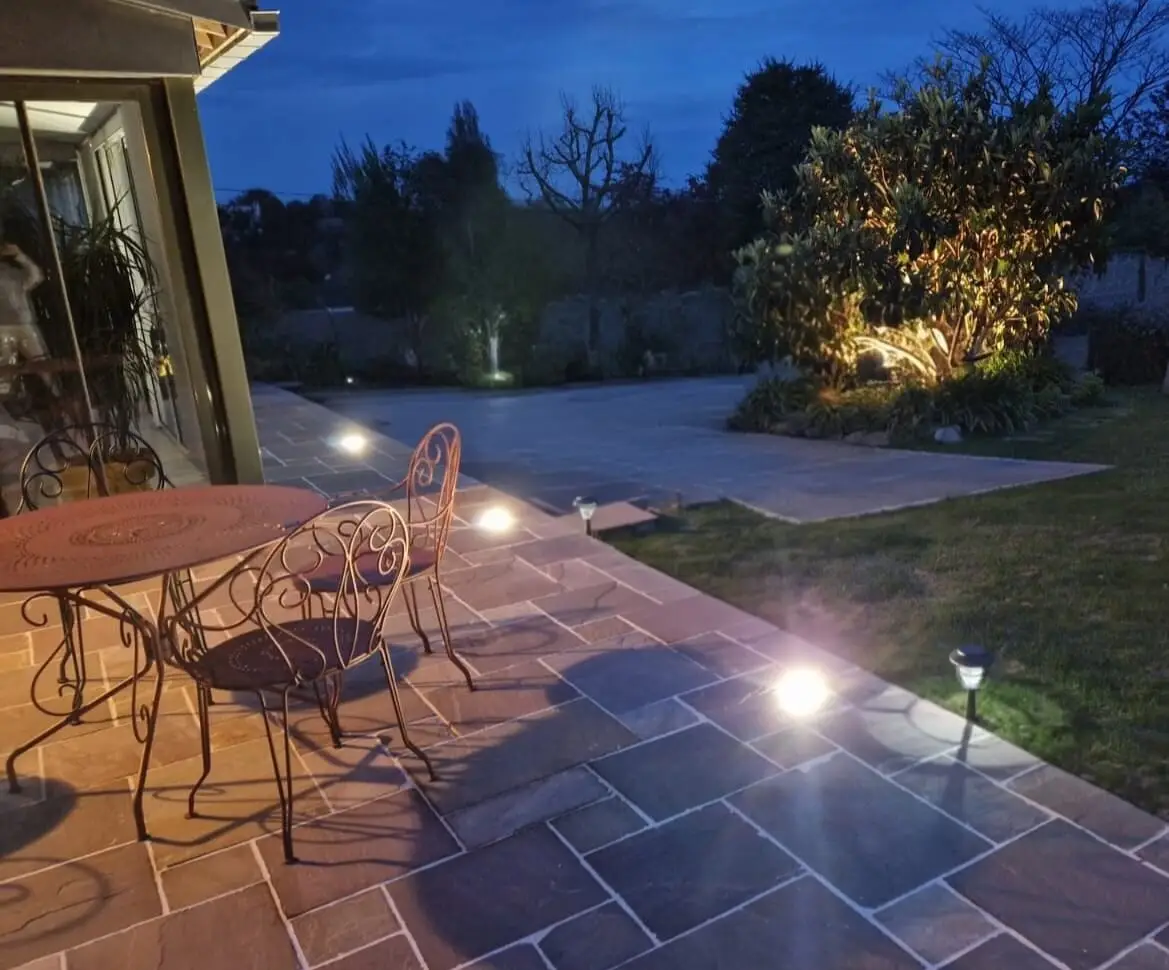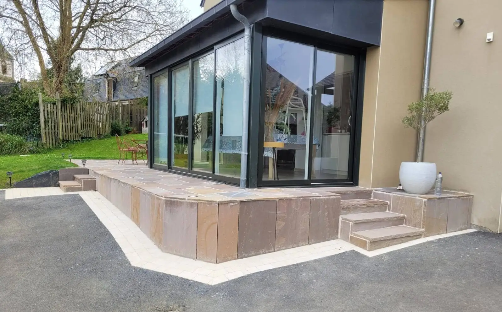Une autre terrasse plus grande, pour y accueillir un salon de jardin, en grés multicolore opus 4 formats à été réalisé. Deux escaliers et des paillis, également en grés multicolore, on été travaillé pour permettre un cheminement autour de la véranda.