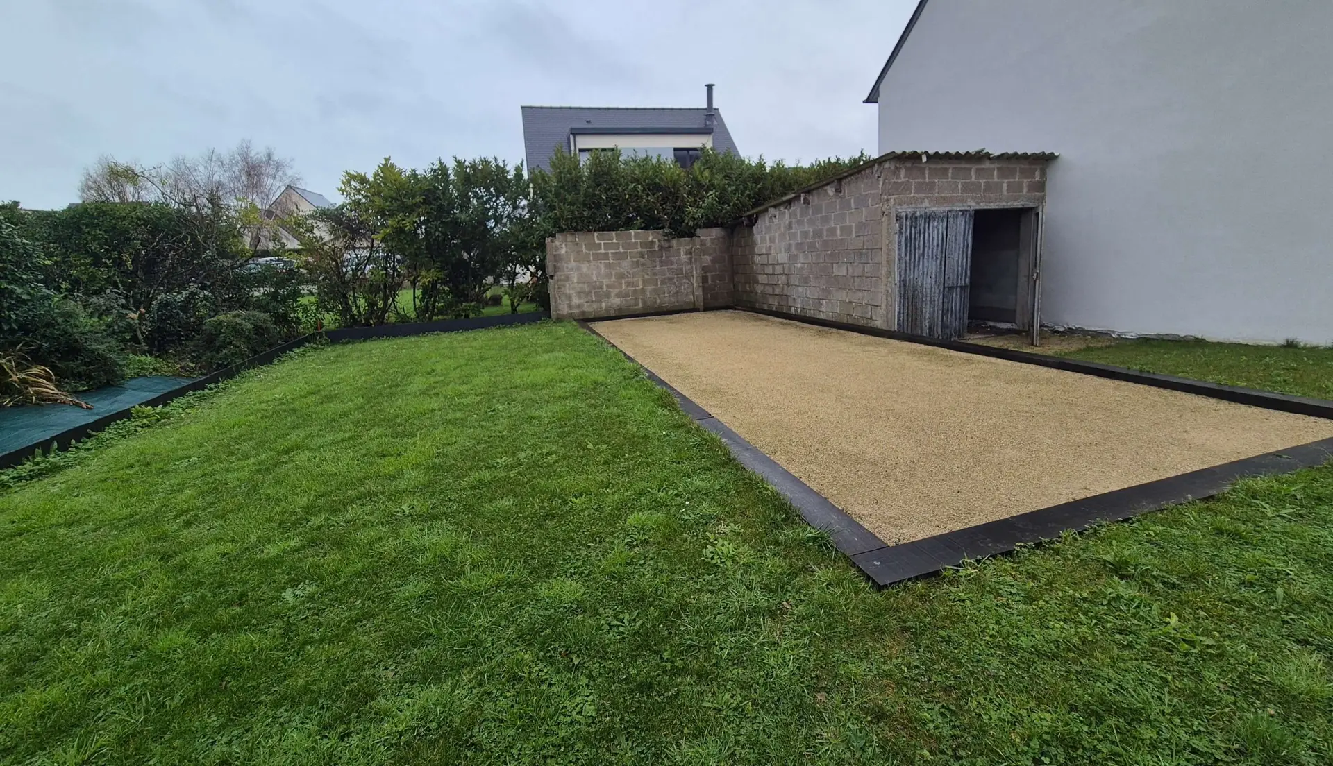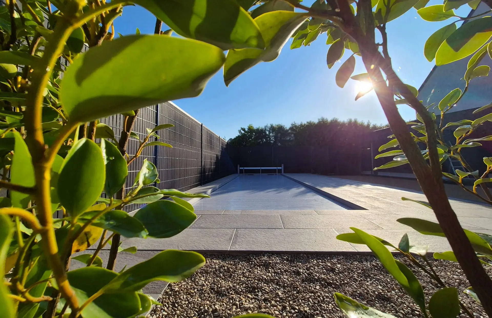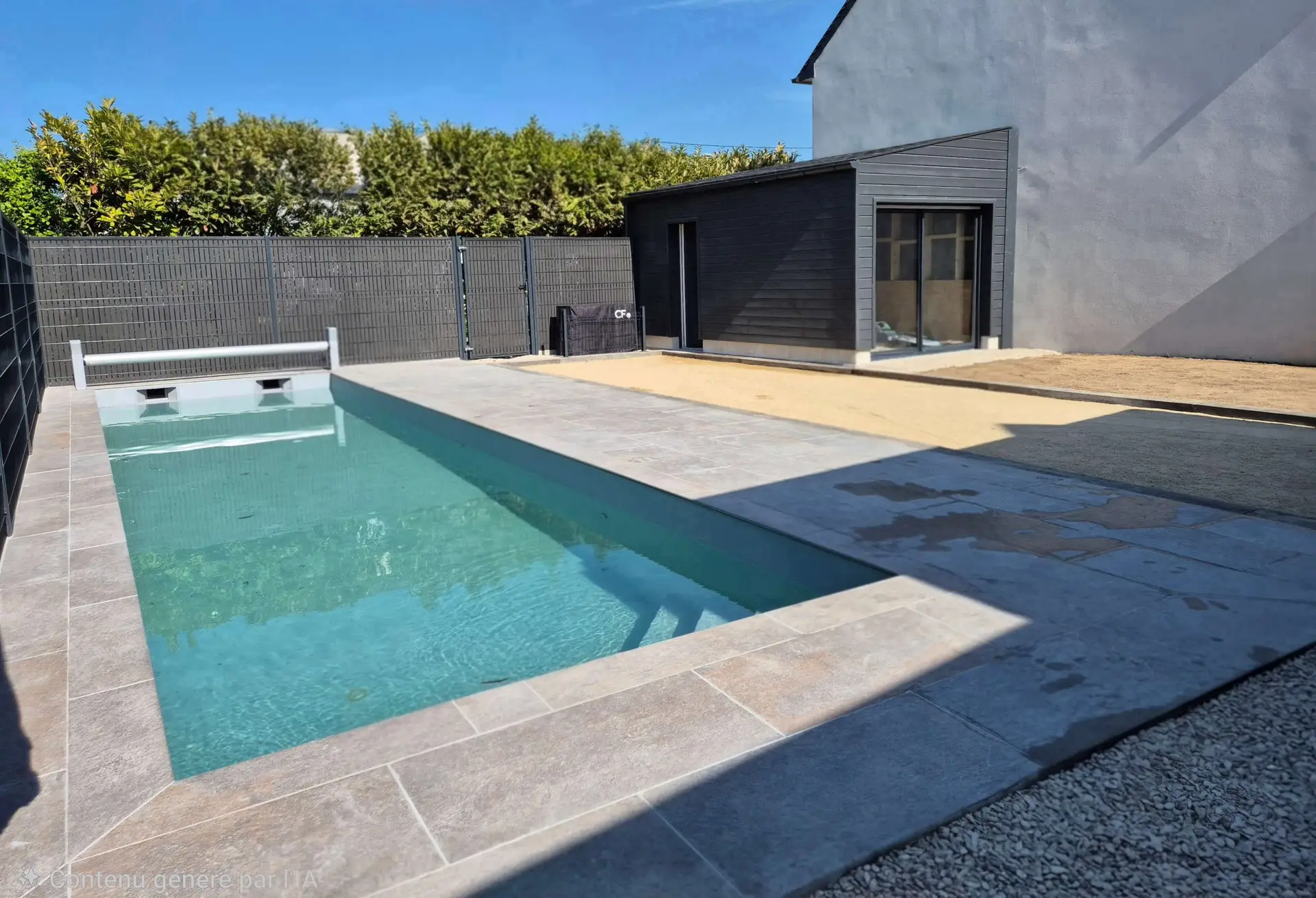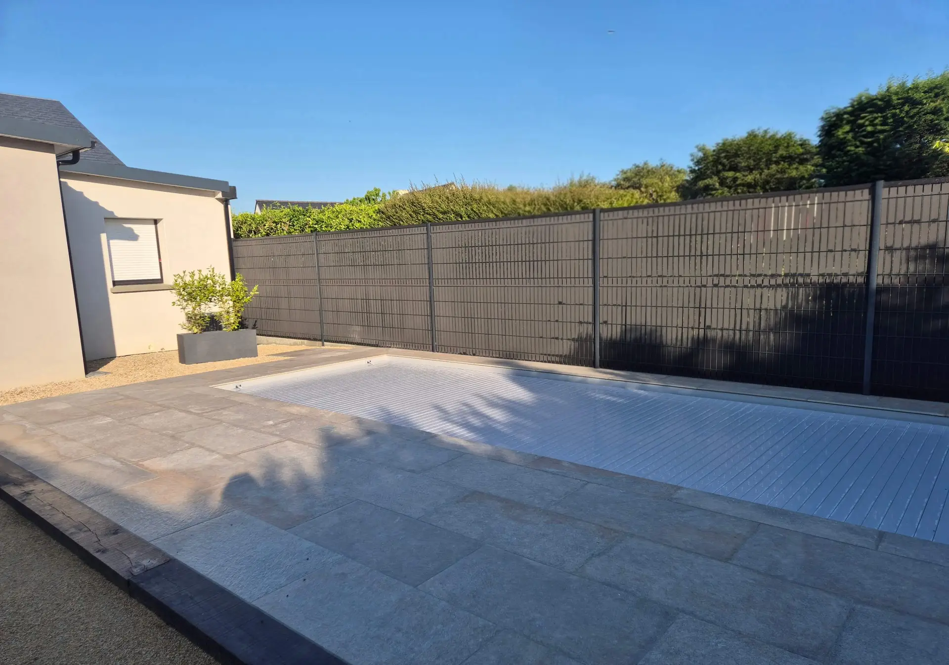 Pour ce projet situé dans la région malouine, nos clients rêvaient d’un espace extérieur tout-en-un, mêlant détente, esthétique et fonctionnalité. Nous avons conçu un couloir de nage de 2,5 x 10 m, autour duquel s’articulent une terrasse, une clôture, un cabanon, un terrain de pétanque et une zone engazonnée.